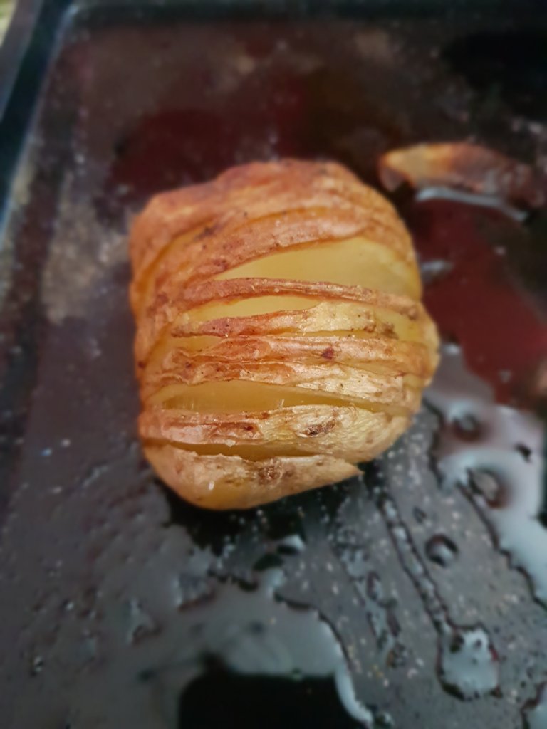 Thus ends the week of the potato. It started with curried aloo matar. Then came the jacket potatoes and battered cod. Next was the day of roast chicken with potato wedges. Finally, the week has come to a close with Hassleback Potatoes served with tuna mayo, sweetcorn and chopped cucumbers. Hopefully, we’re back to plain old roti and curry from tomorrow.