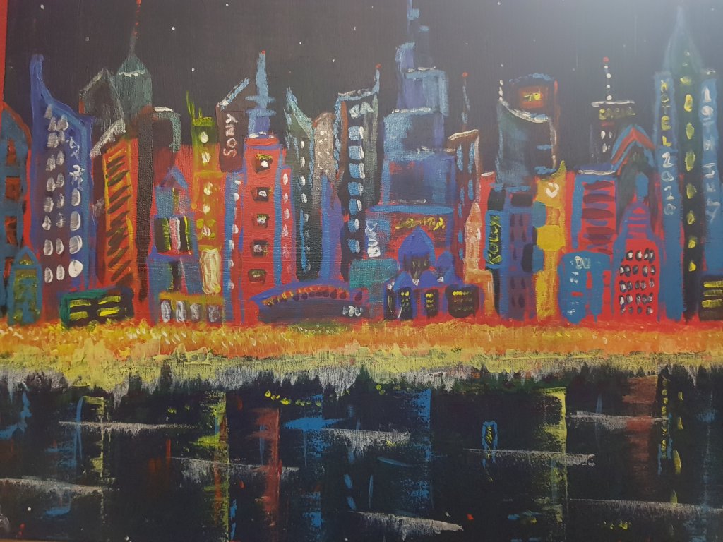 Cyberpunk Cityscape inspired by the Dubai Marina. Acrylic on canvas.